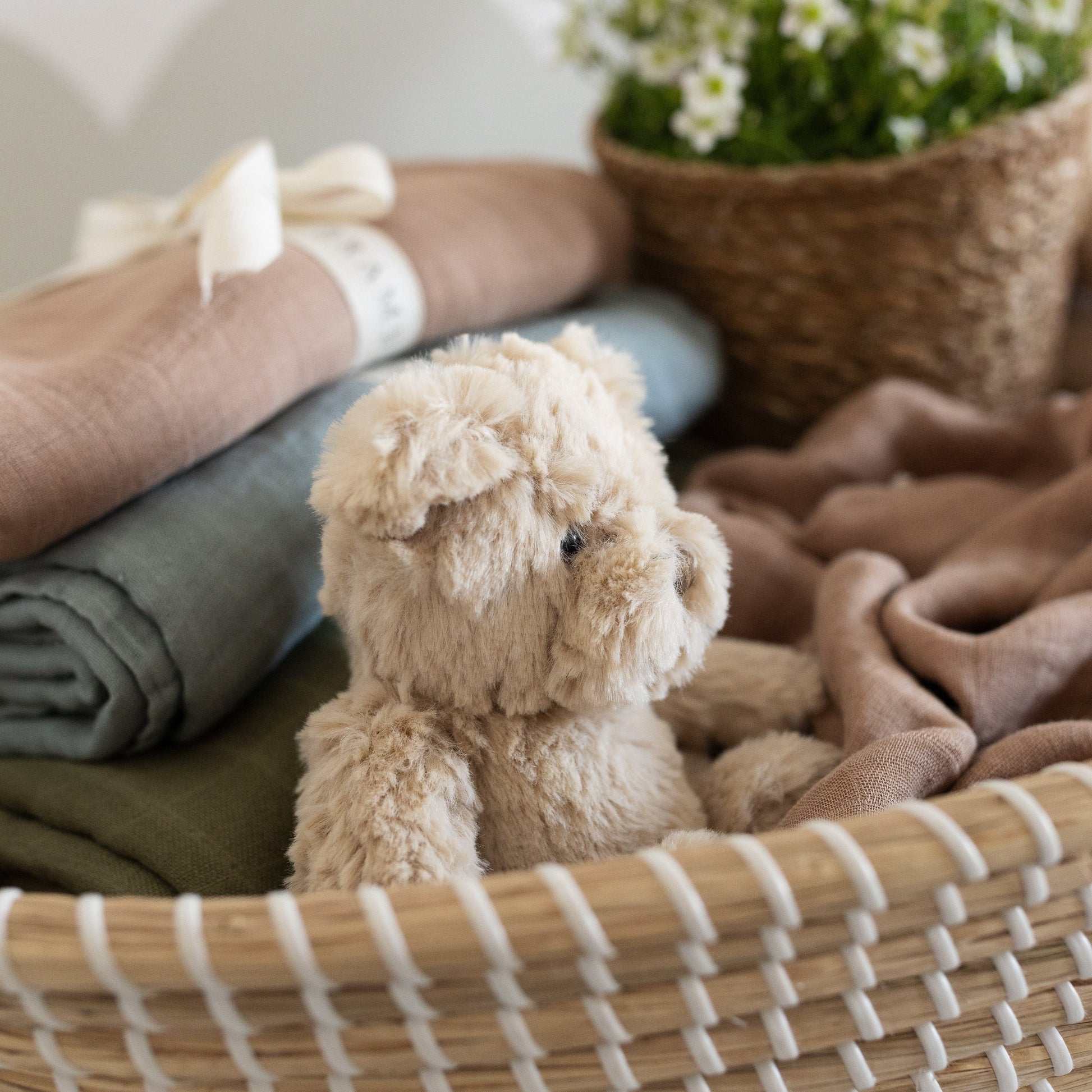 Adorably cute mini bear, with beautifully soft beige fur. The perfect cuddly, squidgy gift for new babies.
